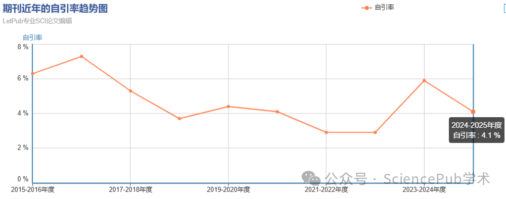 期刊在自引率控制方面表现较好,近年来基本维持在6%以下,这表明期刊遵守着较高的出版规范,学术质量可靠