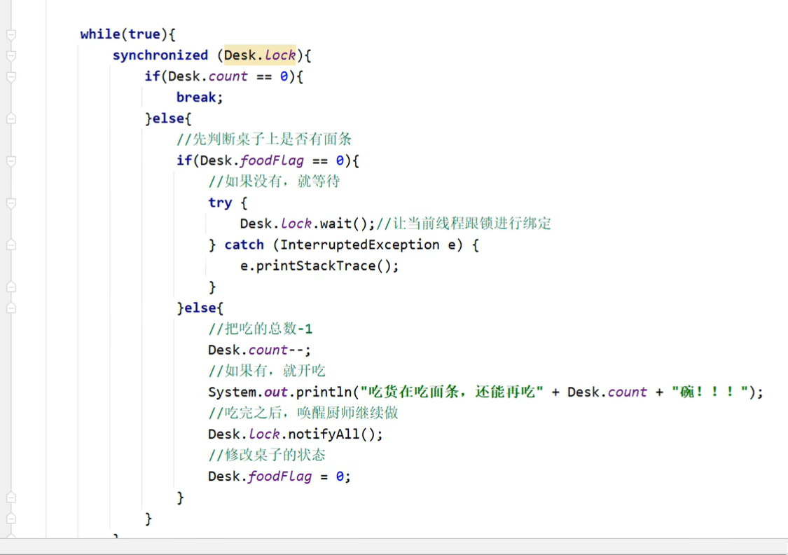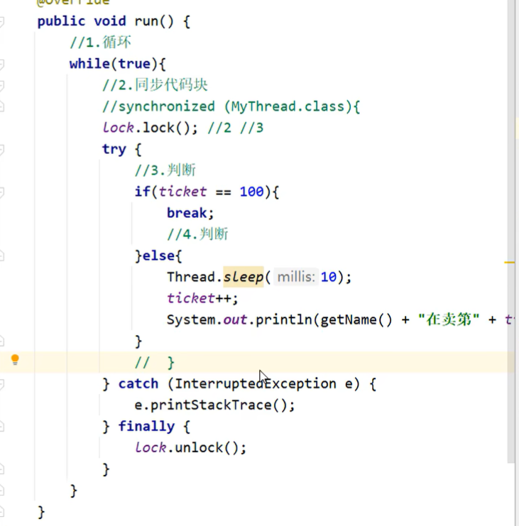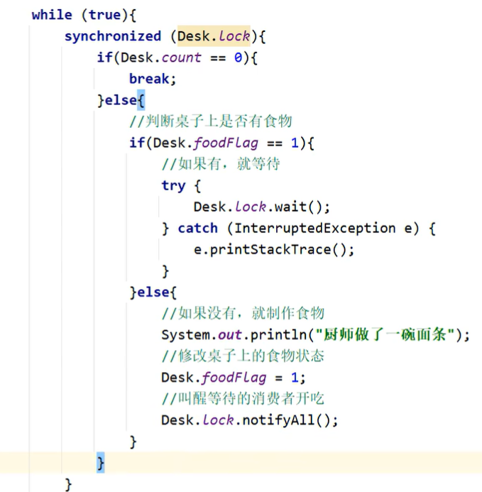1、循环不能写在锁里面,synchronized必须卸写在循环里面,否则一个线程会一直运行直到结束