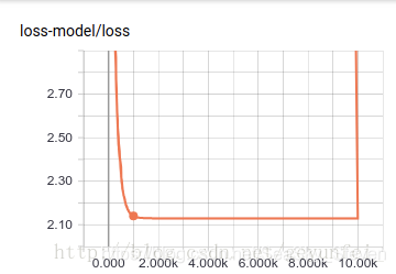 首先在 SCALARS 页面我们可以看到我们通过 tf.summary.scalar("loss", loss)设置的loss收敛曲线,从曲线图中可以看出在训练了大概2000次的时候loss就已经收敛的差不多了。