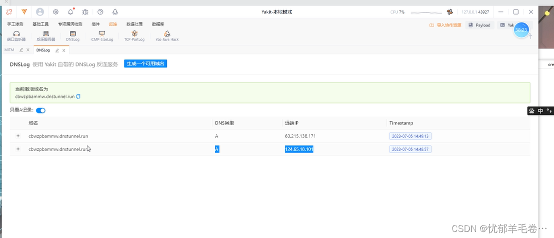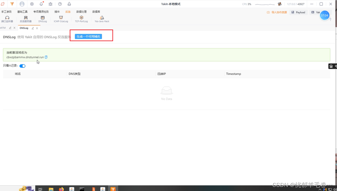 yakit自带dnslog平台,申请域名,执行命令,ping一下域名,