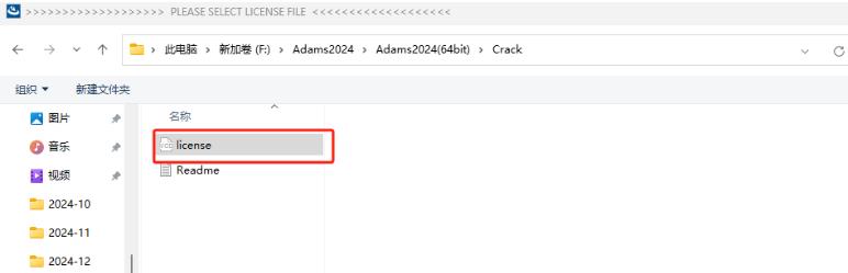 3.打开安装包解压后的【Adams2024(64bit)】文件夹中的【Crack】文件夹并选中【license.dat】,点击【打开】