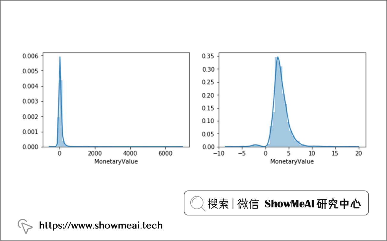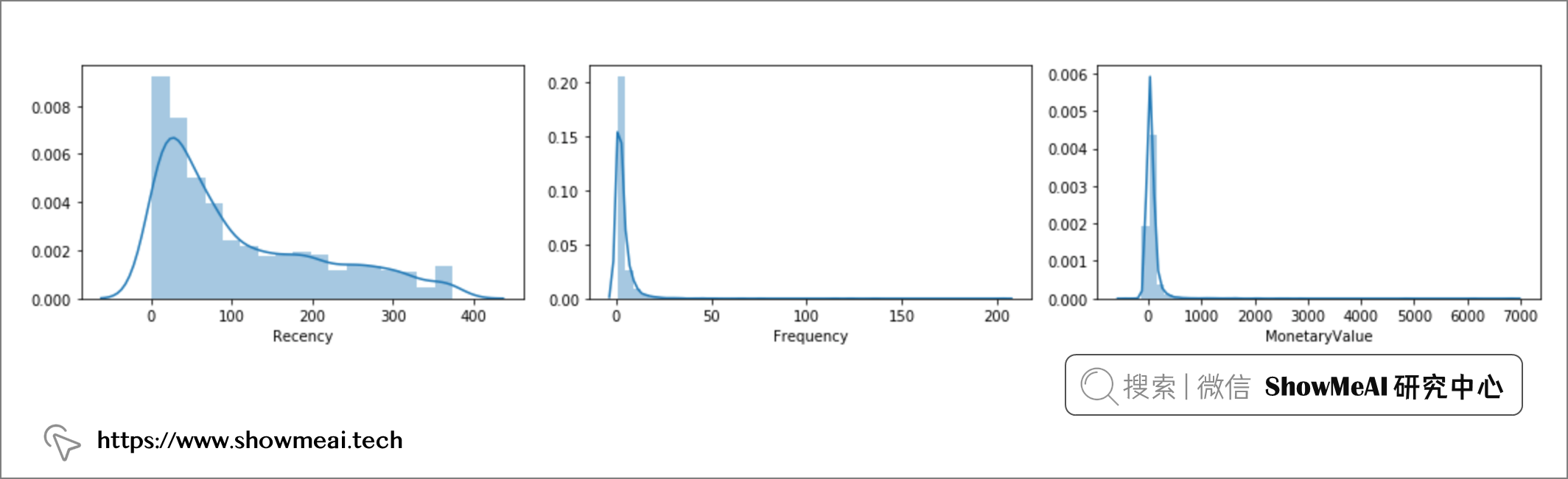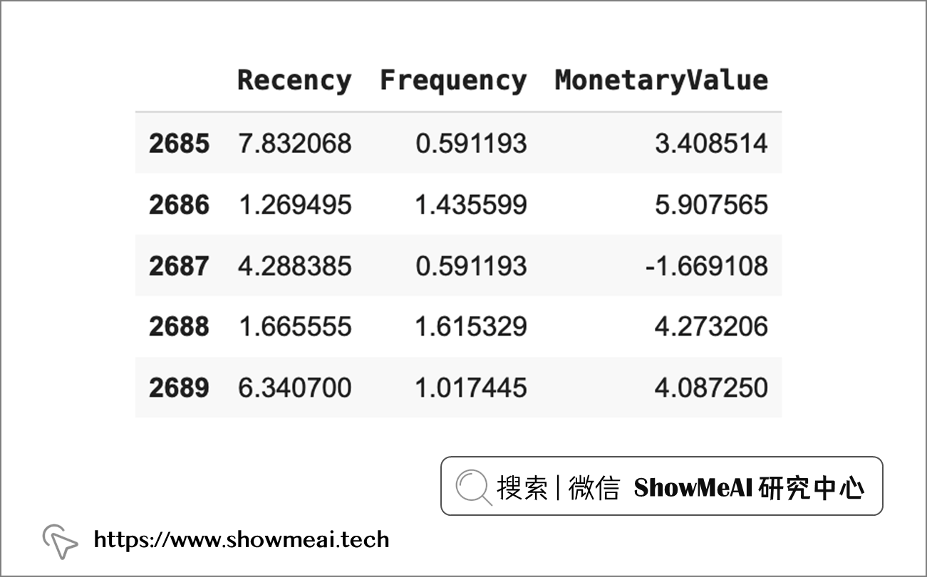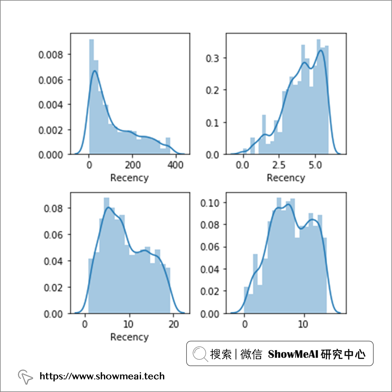 根据图像可视化,我们分别对Recency、Frequency、MonetaryValue选择box-cox变换,box-cox变换和三次方根(cbrt)变换。