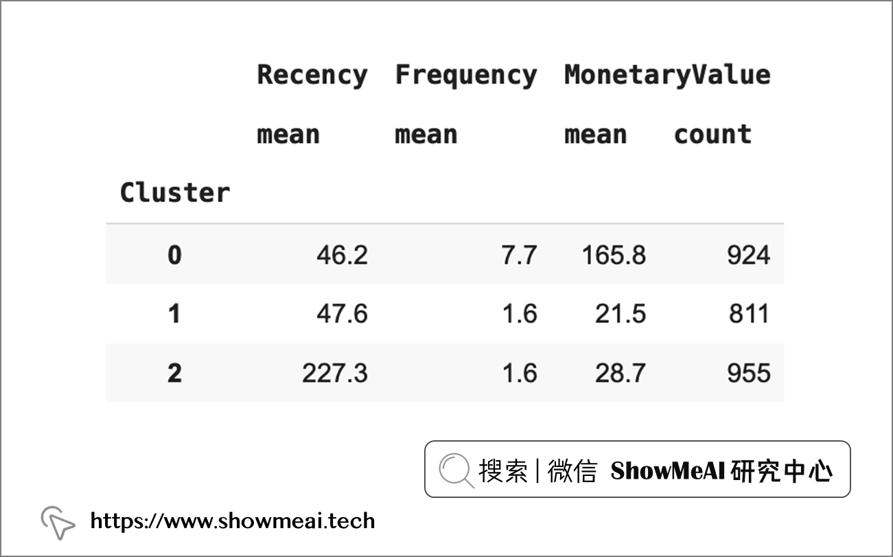我们基于聚类结果来对用户群做一些解读和业务理解,这里我们将聚类得到的 3 个 cluster 的聚类中心信息输出,代码如下: