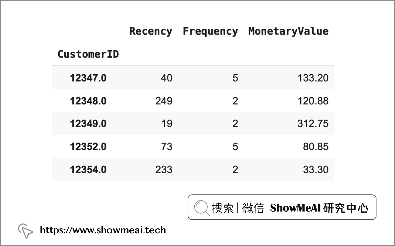 数据准备好之后,为了细分客户,我们会对数据做处理,拿到一些核心指标,比如客户上次购买产品的时间,客户购买产品的频率以及客户为产品支付的费用。