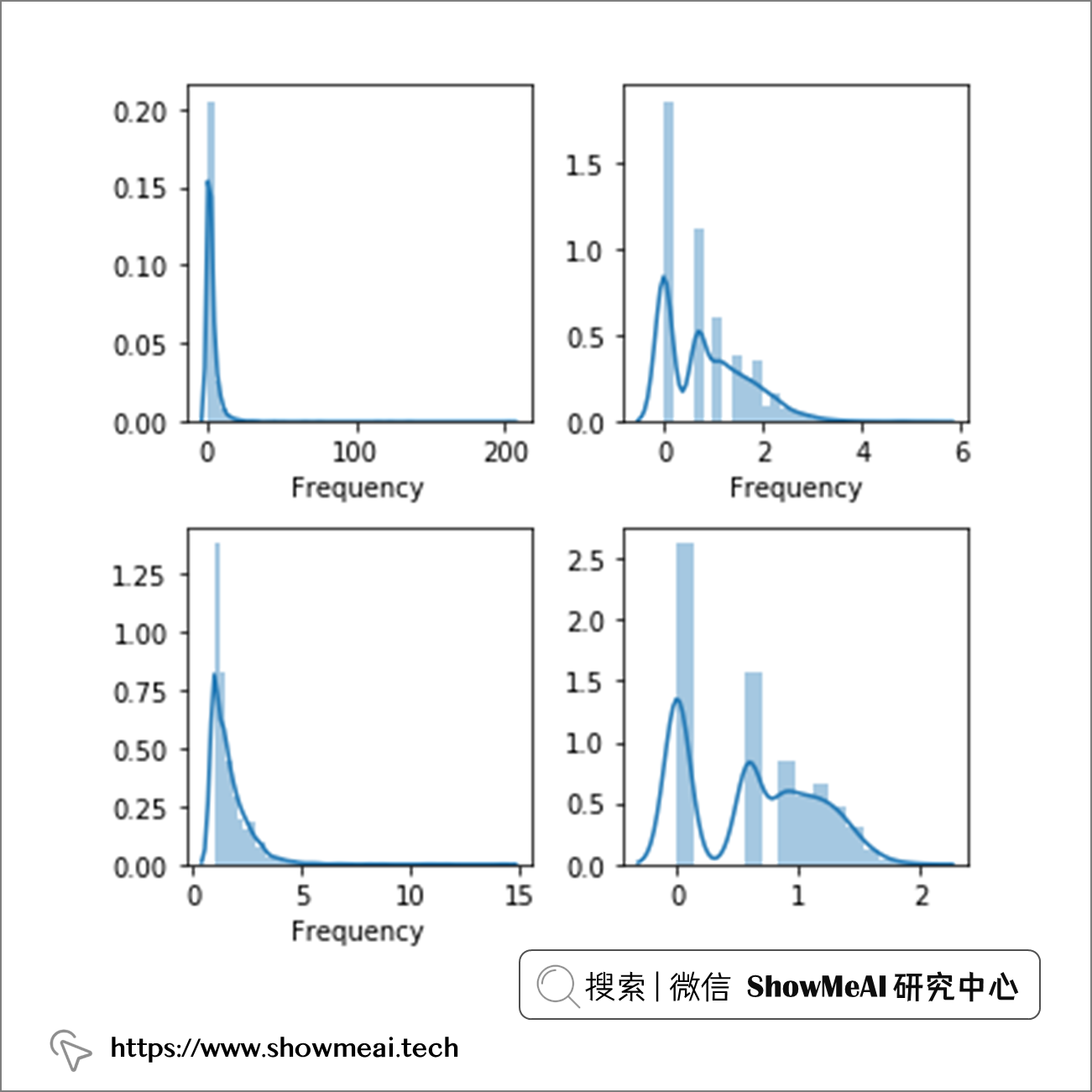 我们可以对原始数据,分别使用『对数变换』、『平方根变换』和『box-cox 变换处理』,把分布绘制如下: