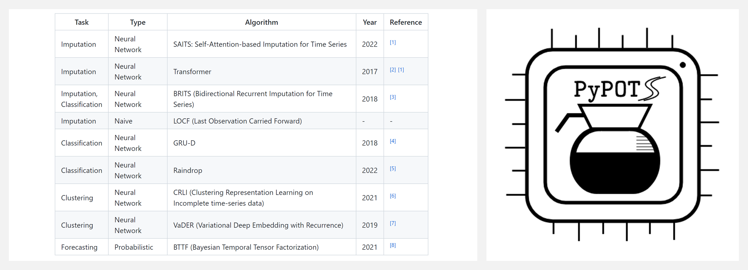 PyPOTS 是一个用于时间序列数据挖掘的 Python 工具库,支持对具有缺失值的不完整多变量时间序列进行预测/计算/分类/聚类的任务。