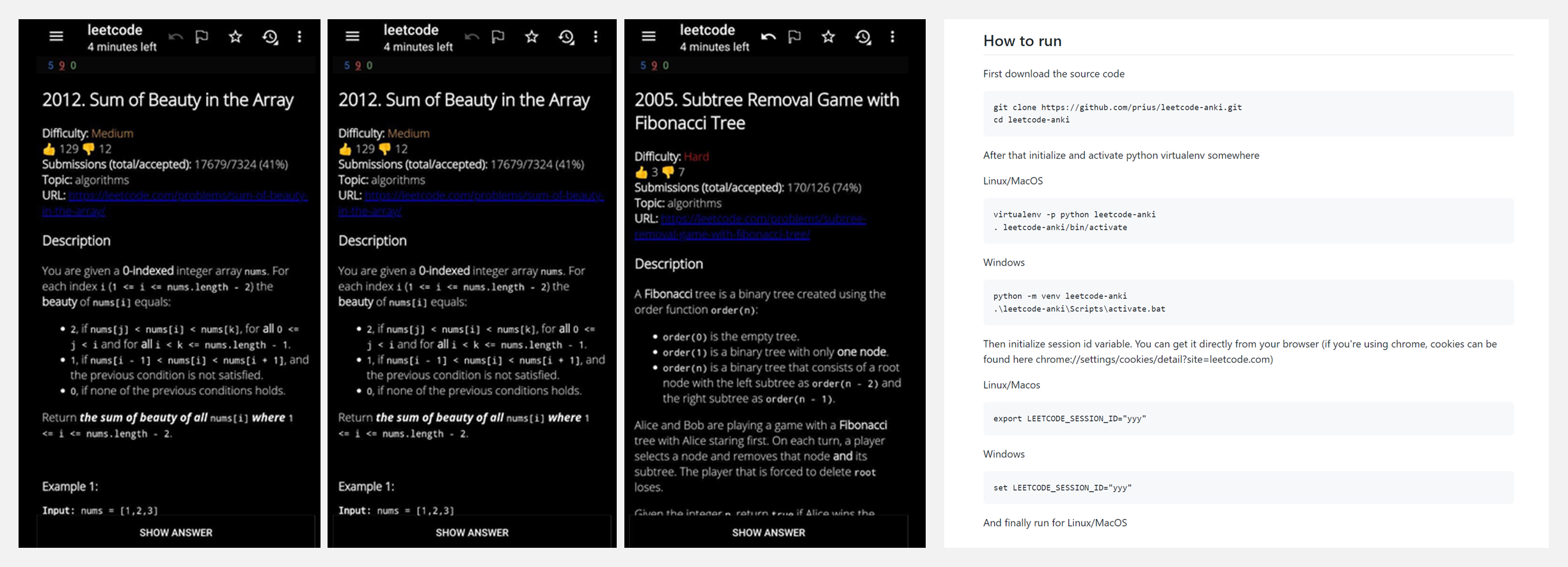 刷题神器,通过运行这个项目的脚本,可以自动生成带有所有leetcode问题的 Anki 卡片,方便刷题和学习。