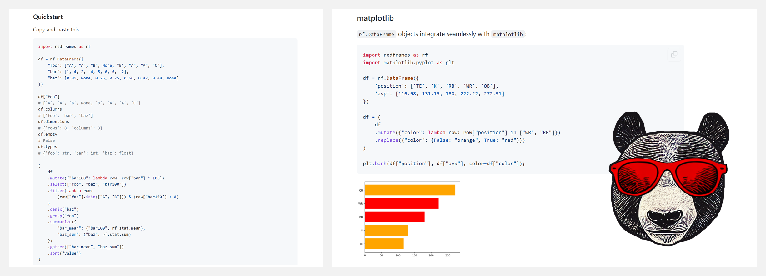 redframes(rectangular data frames)是一个用于机器学习和可视化的数据操作工具库。它与pandas完全互通,与scikit-learn兼容,并且兼容matplotlib工具库。