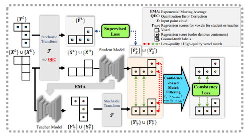 本文研究了半监督3D目标检测问题,考虑到杂乱的室内3D场景的高标注成本,这是一个非常重要的问题。虽然这一范式对图像级或像素级预测很自然,但将其应用到检测问题面临提案匹配的问题。之前的方法基于两阶段管道,匹配在第一阶段中生成的经验选择的提案,导致训练信号空间稀疏。相比之下,作者提出了第一个以单阶段方式工作的半监督3D检测算法,允许空间密集的训练信号。这个新设计的一个基本问题是点到体素量化引起的量化误差,这不可避免地导致体素域中两个变换视图之间的失配。为此,作者推导和实现了在线补偿这种失配的封闭形式规则。