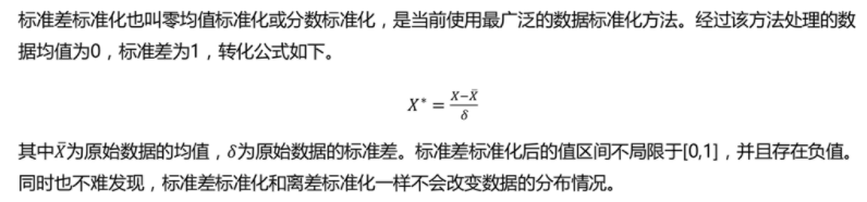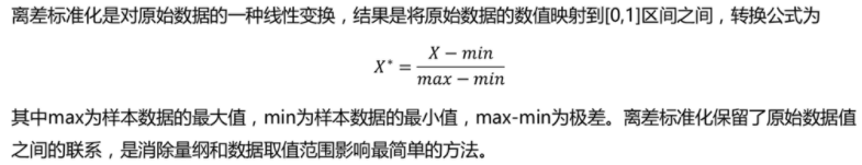 - 同时,还可以看出离差标准化的缺点:若数据集中某个数值很大,则离差标准化的值就会接近于0,并且相互之间差别不大。若将来遇到超过目前属性[min,max]取值范围的时候,会引起系统出错,这时便需要重新确定min和max。