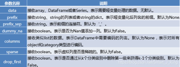 pandas.get_dummies(data, prefix=None, prefix_sep='_', dummy_na=False, columns=None, sparse=False, drop_first=False)