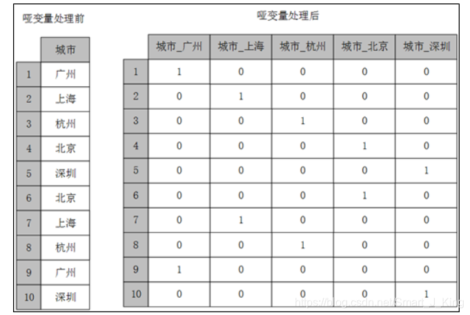 数据分析模型中有相当一部分的算法模型都要求输入的特征为数值型,但实际数据中特征的类型不一定只有数值型,还会存在相当一部分的类别型,这部分的特征需要经过哑变量处理才可以放入模型之中。哑变量处理的原理示例如图: