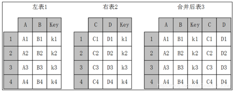主键合并,即通过一个或多个键将两个数据集的行连接起来,类似于SQL中的JOIN。针对同一个主键存在两张包含不同字段的表,将其根据某几个字段一一对应拼接起来,结果集列数为两个元数据的列数和减去连接键的数量。