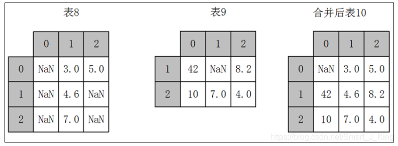 数据分析和处理过程中若出现两份数据的内容几乎一致的情况,但是某些特征在其中一张表上是完整的,而在另外一张表上的数据则是缺失的时候,可以用combine_first方法进行重叠数据合并,其原理如下。