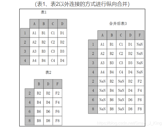 使用concat函数时,在默认情况下,即axis=0时,concat做列对齐,将不同行索引的两张或多张表纵向合并。在两张表的列名并不完全相同的情况下,可join参数取值为inner时,返回的仅仅是列名交集所代表的列,取值为outer时,返回的是两者列名的并集所代表的列,其原理示意如图。