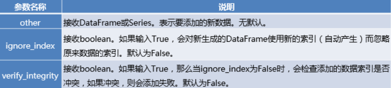 pandas.DataFrame.append(self, other, ignore_index=False, verify_integrity=False)