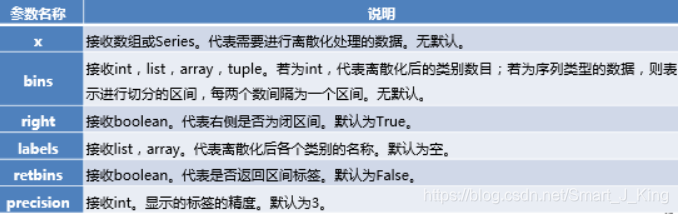pandas.cut(x, bins, right=True, labels=None, retbins=False, precision=3, include_lowest=False)