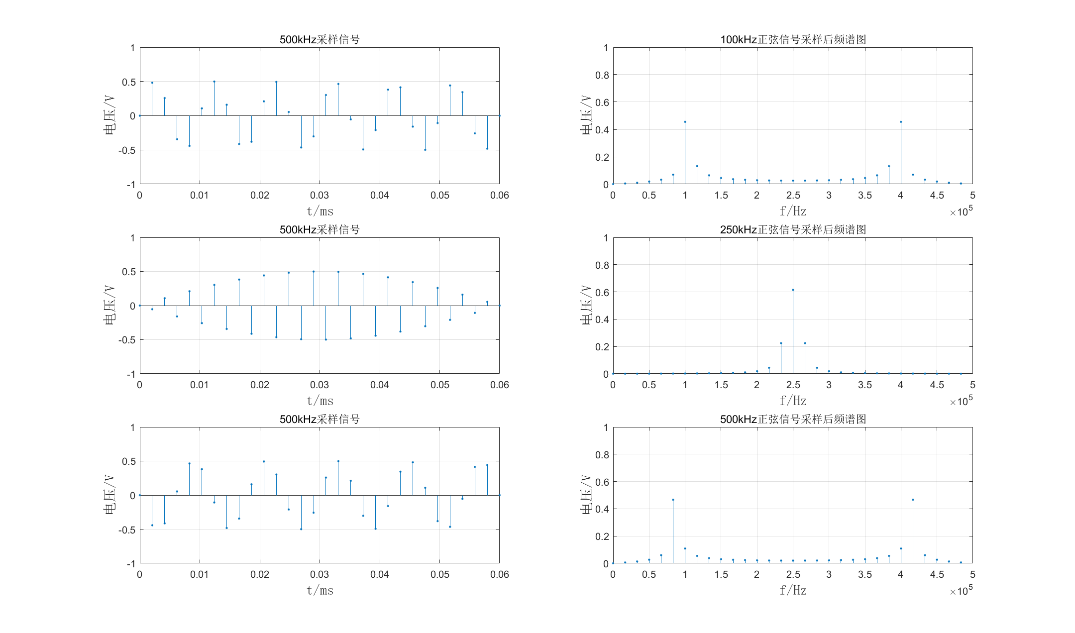500kHz采样信号不满足采样定理,发生频谱混叠,但是因为采样信号只有一个主要频率,因此不明显。