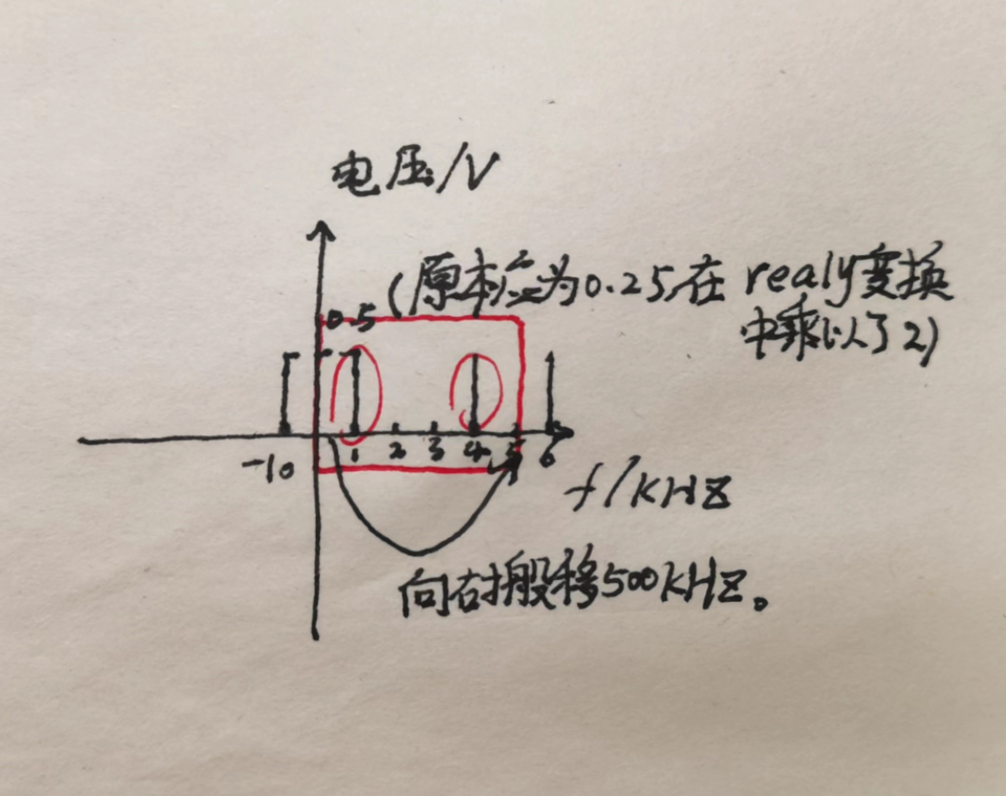 100kHz采样信号的频谱在100kHz和400kHz处有较大值,其中100kHz为原始正弦信号频率,400kHz为信号频谱负数频率中的-100kHz经过500kHz信号频率向右搬移得到,原理如下图所示(不小心画了个诡异的笑脸):