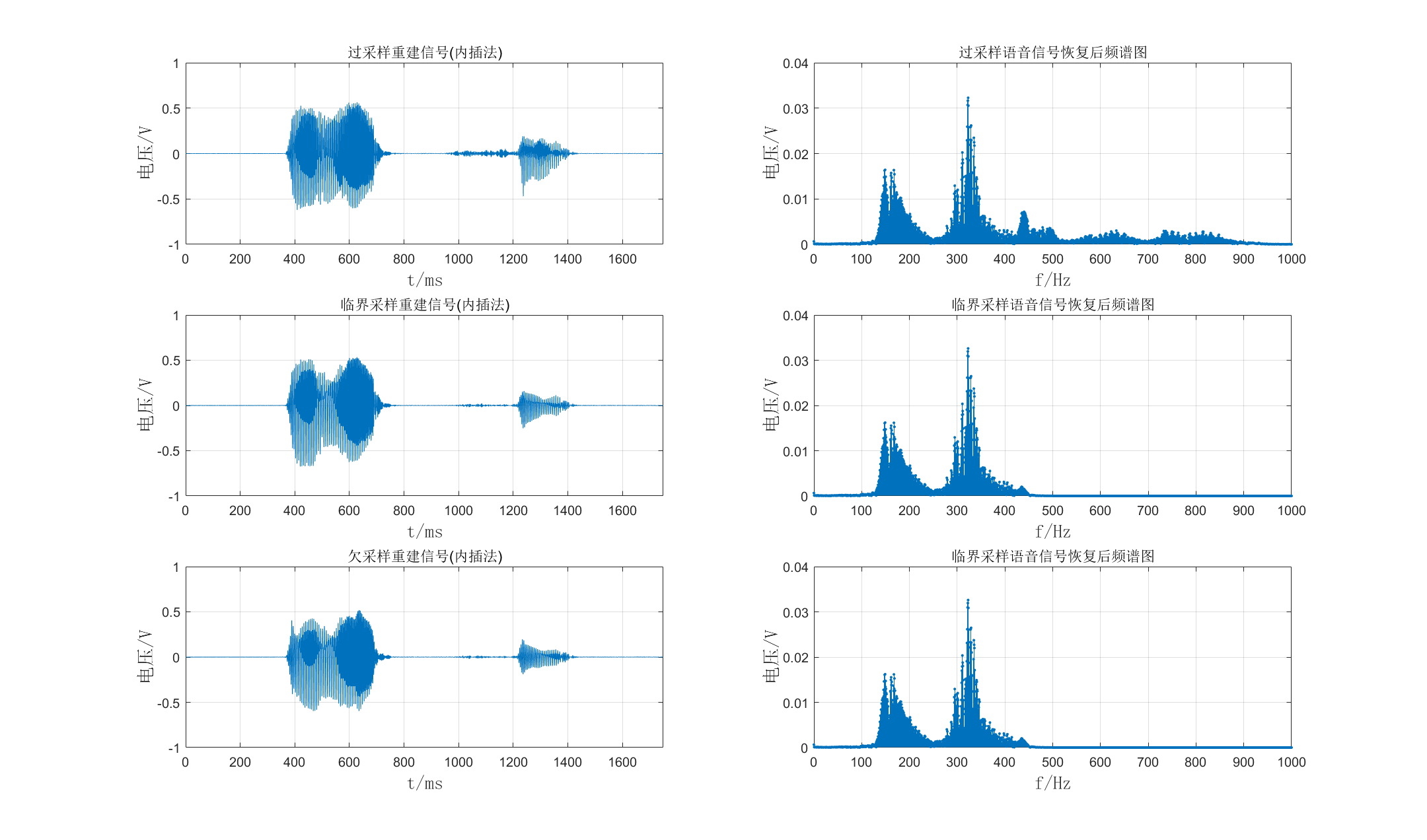 由上图中右侧的三幅信号恢复后的频谱图可知,临界采样和欠采样混叠部分的频率部分消失;左侧三幅恢复后的时域图与采样的时域图相比,曲线变得更密,但三幅图相互比较无很大区别。