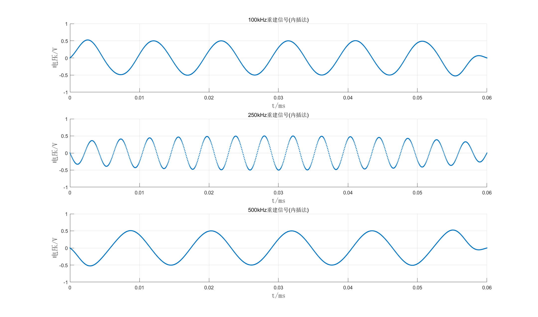 要求:固定采样频率500 kHz,分别对100 kHz、250 kHz、400 kHz的正弦波信号(幅度,相位自定义)进行采样和重建,分析比较原信号与重建信号的波形。