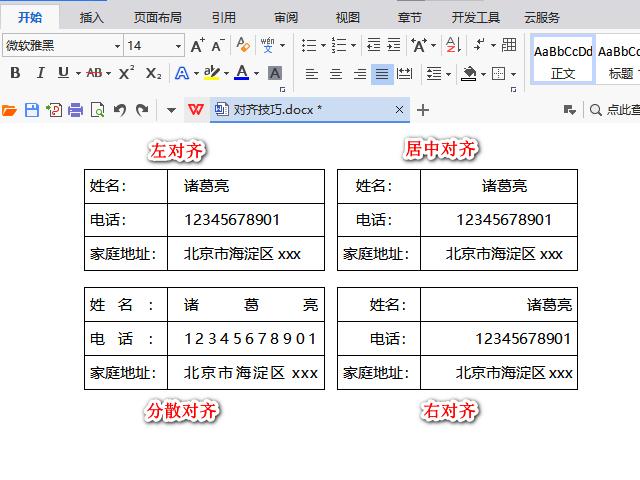- 单元格内文本对齐:选中表格中的部分或全部单元格,使用“开始”选项卡中的“段落”对齐方式(如左对齐、居中、右对齐等),这些设置决定了文本在单元格内的相对位置。