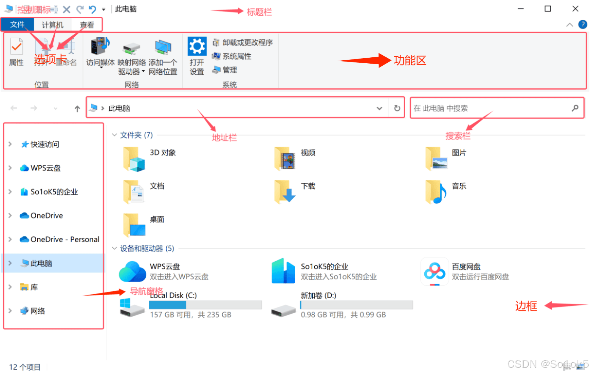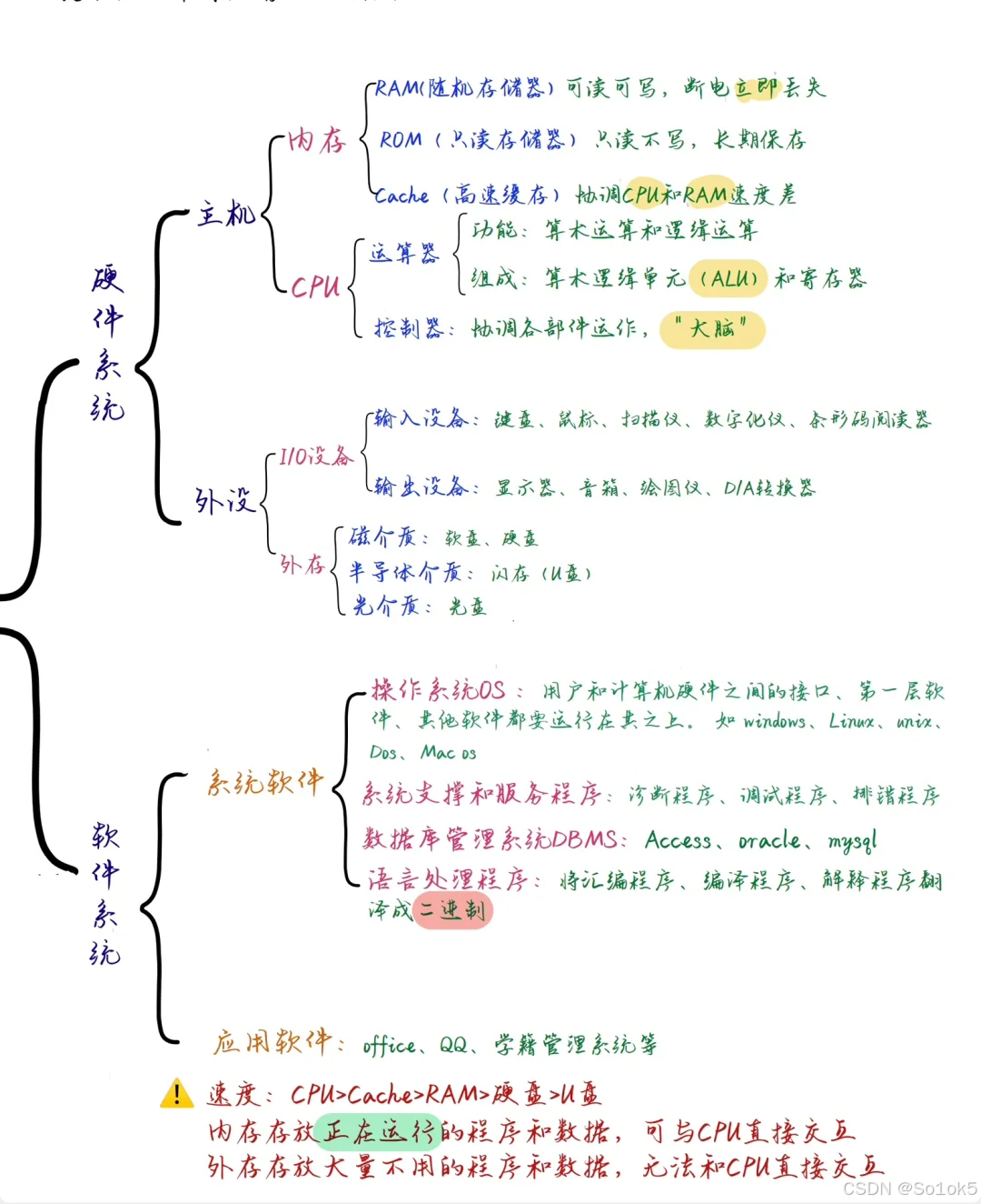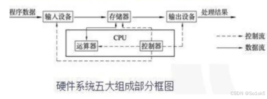- 硬件由5大部分构成:运算、控制、存储、输入、输出。