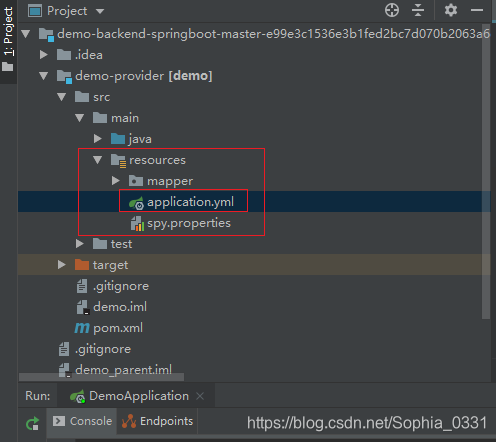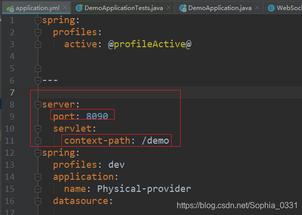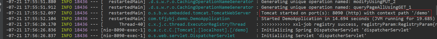 运行项目,项目启动时会打印出端口号和路径,如下图端口号为8090,context path为 ‘/demo’