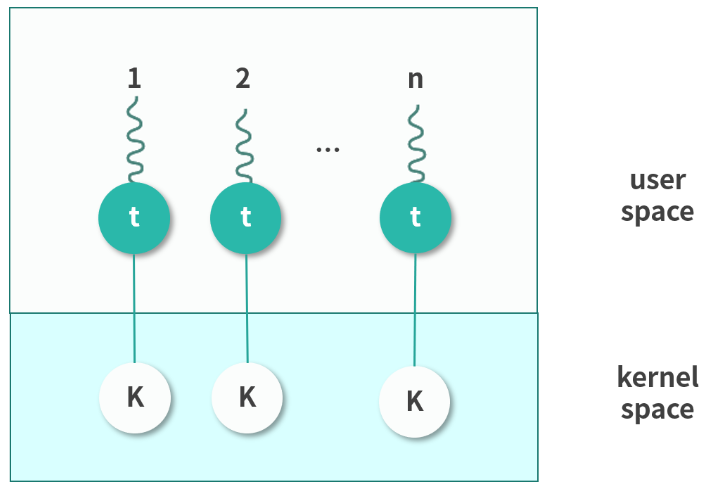 该模型为每个用户态的线程分配一个单独的内核态线程,在这种情况下,每个用户态都需要通过系统调用创建一个绑定的内核线程,并附加在上面执行。 这种模型允许所有线程并行执行,能够充分利用多核优势,Windows NT 内核采取的就是这种模型。但是因为线程较多,对内核调度的压力会明显增加。