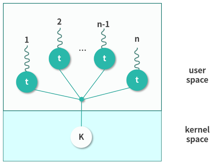 用户态进程中的多线程复用一个内核态线程。这样,极大地减少了创建内核态线程的成本,但是用户级线程不可以并行。因此,这种模型现在基本上用的很少。