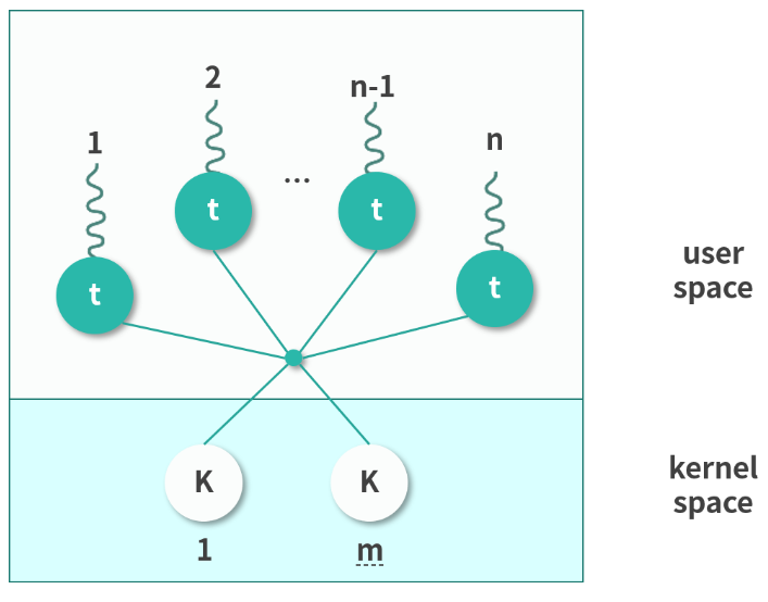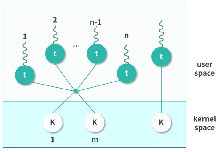 这种模式下会为 n 个用户态线程分配 m 个内核态线程。m 通常可以小于 n。一种可行的策略是将 m 设置为核数。这种多对多的关系,减少了内核线程,同时也保证了多核心并行。Linux 目前采用的就是该模型。