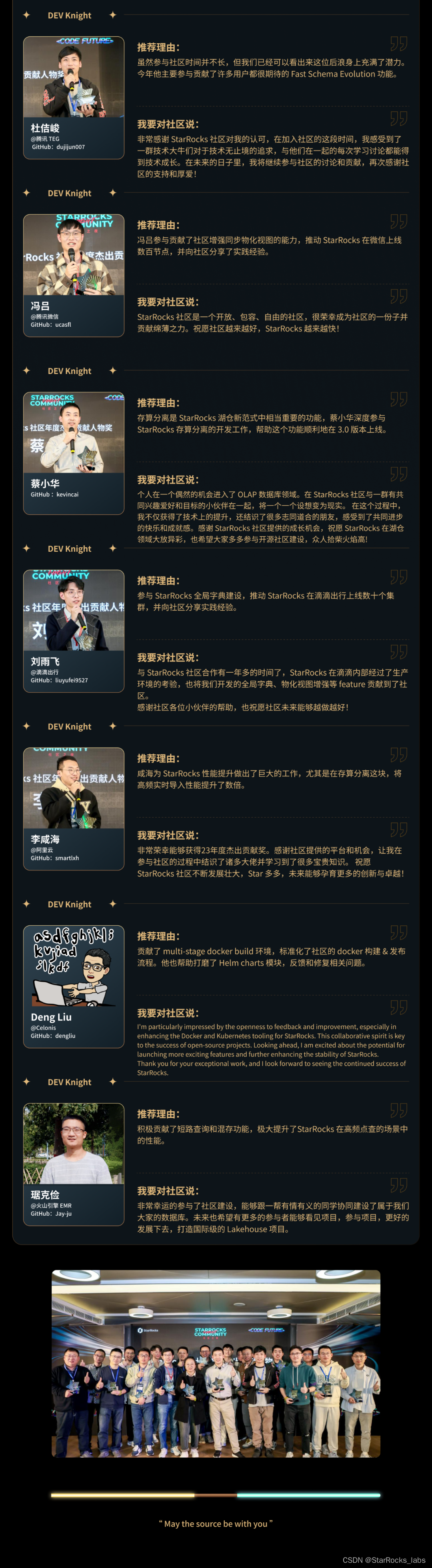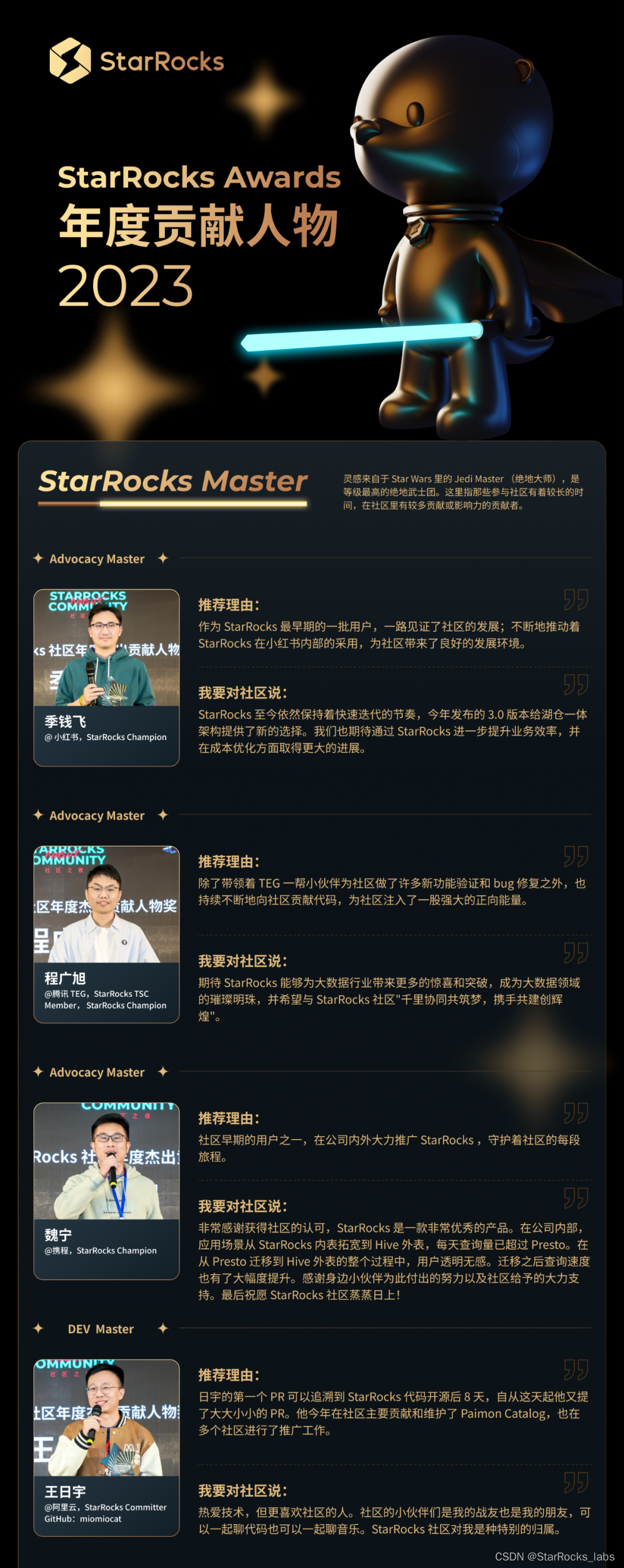 贡献者们的每一行代码、每一场布道,推动着 StarRocks 社区的每一分进步。值此年末之际,我们深怀感恩之心发布了 StarRocks 2023 年度贡献人物榜单。