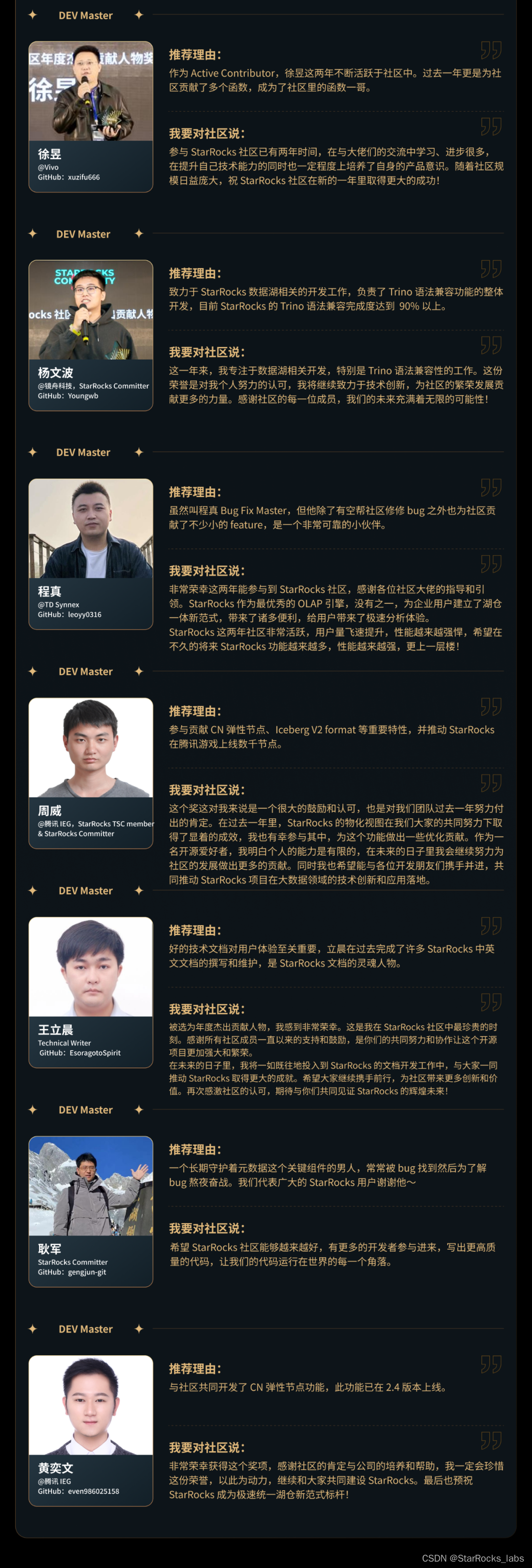 这份榜单分为以代码贡献为主的 DEV 和以布道为主的 Advocacy 两大类别。颁奖典礼的仪式秉承着社区的传统,已于 11/17 峰会结束后的社区之夜隆重举行。现在让我们一同回顾完整的 StarRocks 年度贡献人物名单以及颁奖典礼的精彩瞬间。