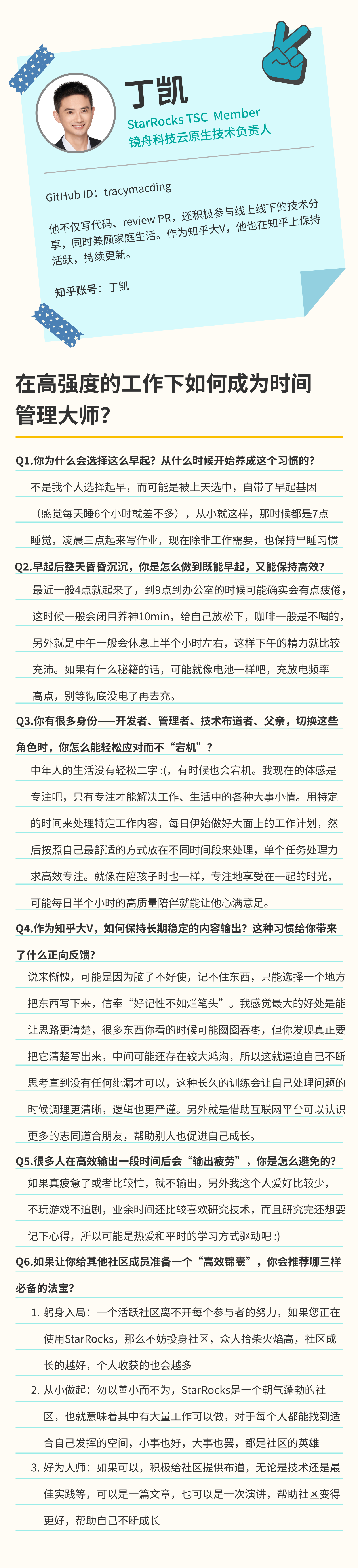 在 StarRocks 社区,也有一位时间管理的“大师”——丁凯。他每天凌晨四点起床,是公认的早起冠军。