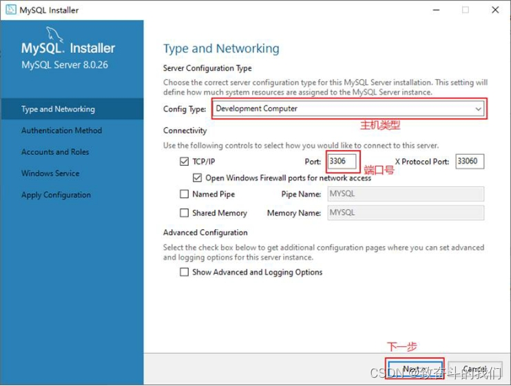 步骤2:单击“Next”(下一步)按钮,进入MySQL服务器类型配置窗口,如图所示。端口号一般选择默认端口号3306。