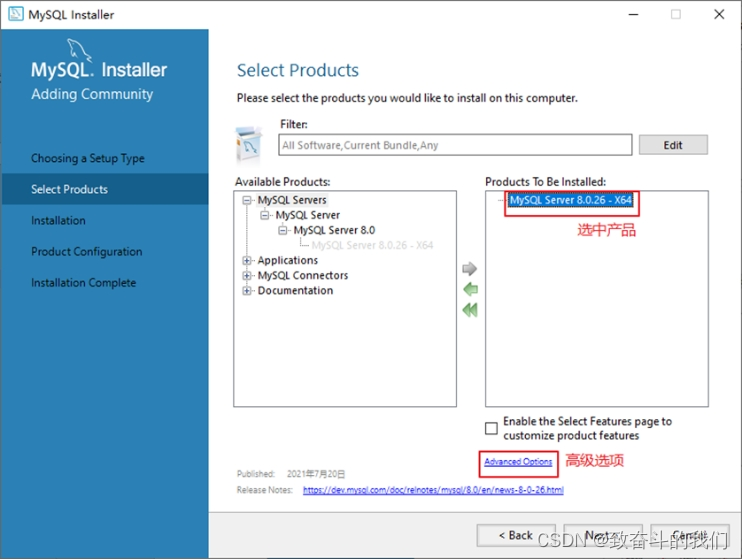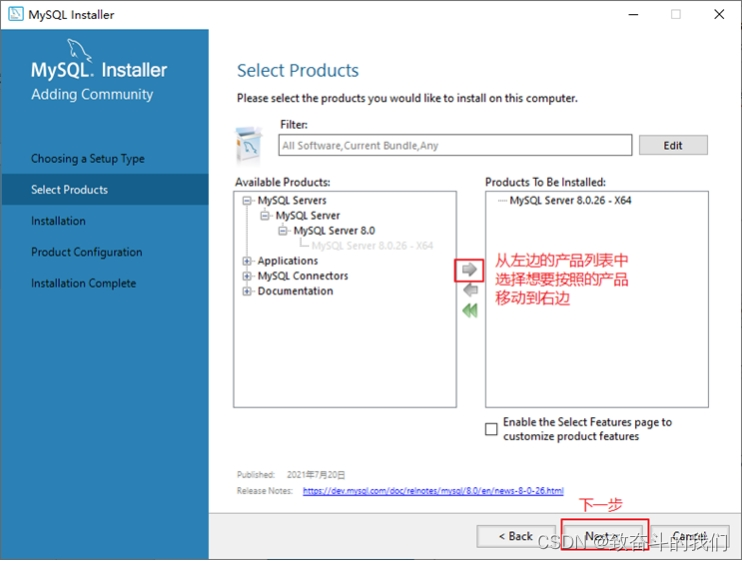 步骤3:打开“Select Products” (选择产品)窗口,可以定制需要安装的产品清单。例如,选择“MySQLServer 8.0.26-X64”后,单击“→”添加按钮,即可选择安装MySQL服务器,如图所示。采用通用的方法,可以添加其他你需要安装的产品。