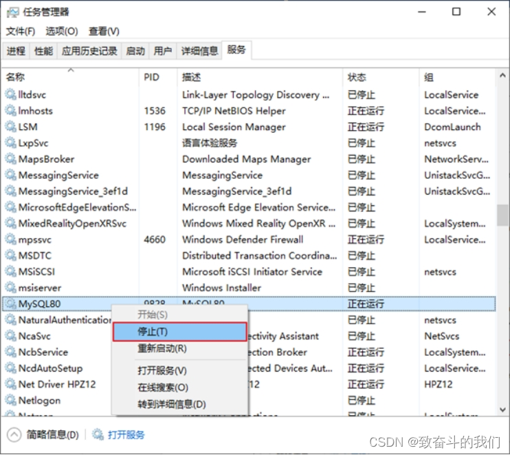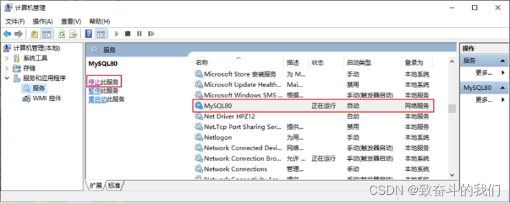 - 步骤2:找到MySQL80(点击鼠标右键)→ 启动或停止(点击)