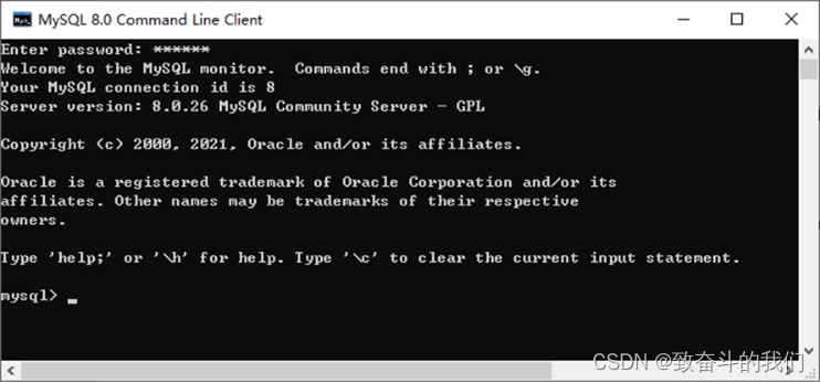 连接成功后,有关于MySQL Server服务版本的信息,还有第几次连接的id标识。 也可以在命令行通过以下方式获取MySQL Server服务版本的信息:
