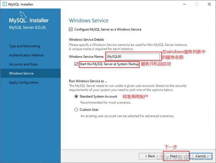 步骤5:单击“Next”(下一步)按钮,打开设置服务器名称窗口,如图所示。该服务名会出现在Windows服务列表中,也可以在命令行窗口中使用该服务名进行启动和停止服务。本书将服务名设置为“MySQL80”。如果希望开机自启动服务,也可以勾选“Start the MySQL Server at System Startup”选项(推荐)。