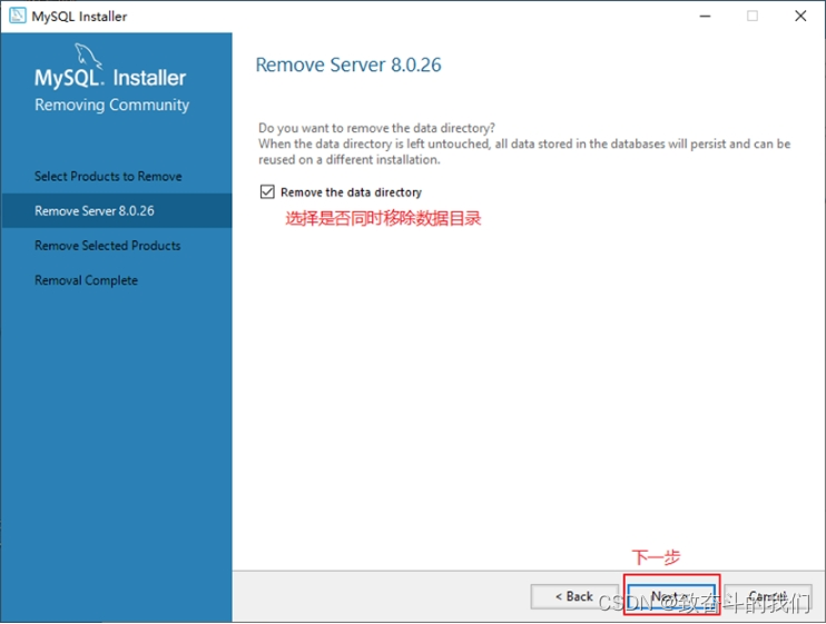 ④ 弹出是否同时移除数据目录选择窗口。如果想要同时删除MySQL服务器中的数据,则勾选“Removethe data directory”,如图所示。