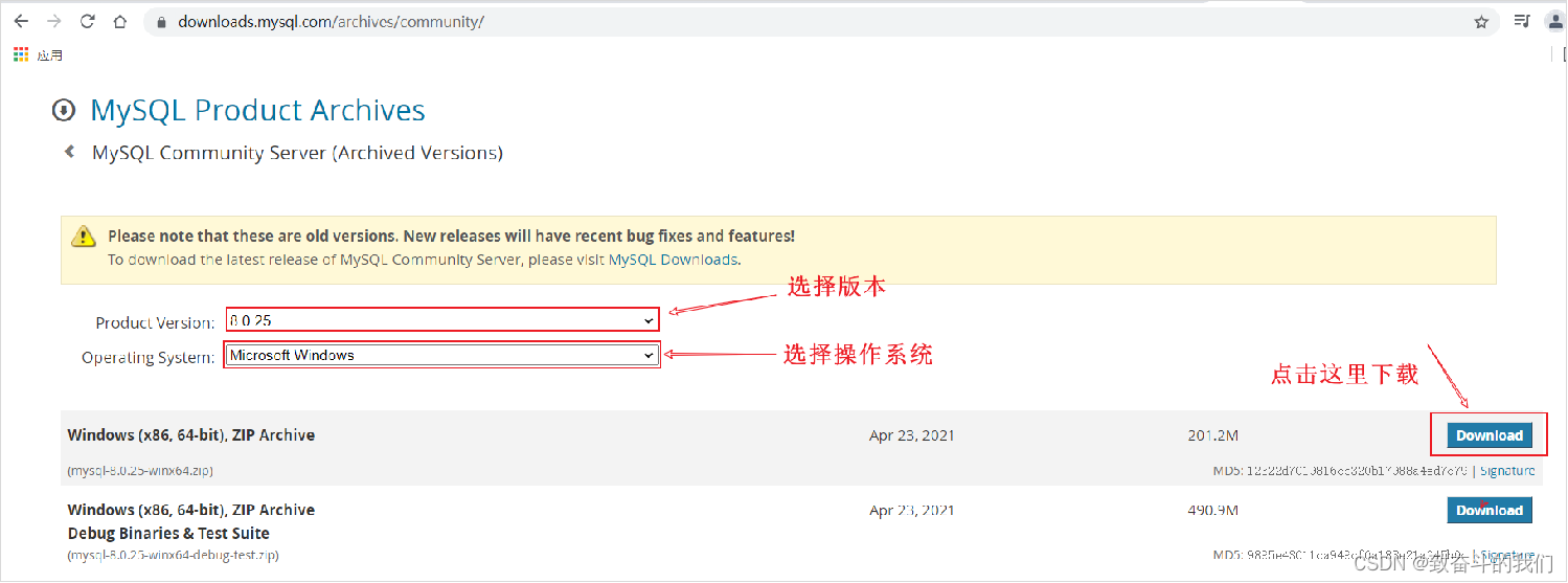 - 如果安装MySQL5.7版本的话,选择 Archives ,接着选择MySQL5.7的相应版本即可。这里下载最近期的MySQL5.7.34版本。