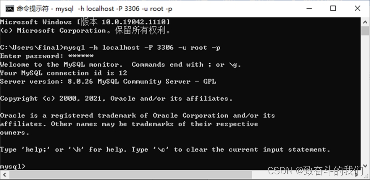 (3)客户端和服务器在同一台机器上,所以输入localhost或者IP地址127.0.0.1。同时,因为是连接本机: -hlocalhost就可以省略,如果端口号没有修改:-P3306也可以省略