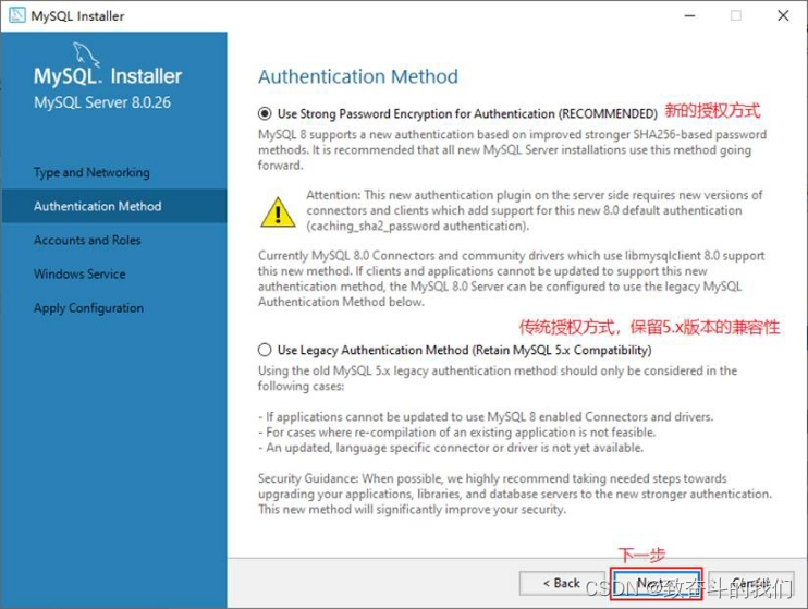 步骤3:单击“Next”(下一步)按钮,打开设置授权方式窗口。其中,上面的选项是MySQL8.0提供的新的授权方式,采用SHA256基础的密码加密方法;下面的选项是传统授权方法(保留5.x版本兼容性)。