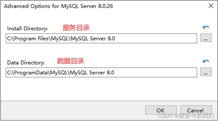 单击“Advanced Options”(高级选项)则会弹出安装目录的选择窗口,如图所示,此时你可以分别设置MySQL的服务程序安装目录和数据存储目录。如果不设置,默认分别在C盘的Program Files目录和ProgramData目录(这是一个隐藏目录)。如果自定义安装目录,请避免“中文”目录。另外,建议服务目录和数据目录分开存放。
