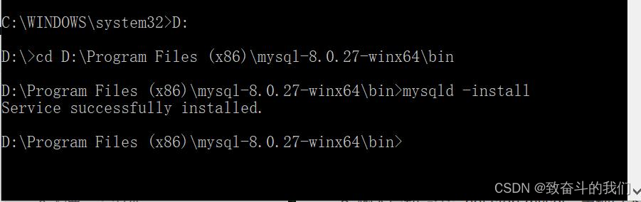 在cmd中进入到D:\Program Files (x86)\mysql-8.0.27-winx64\bin目录下,输入安装命令:mysqld -install,若出现Service successfully installed,证明安装成功;如出现Install of the Service Denied,则说明没有以管理员权限来运行cmd