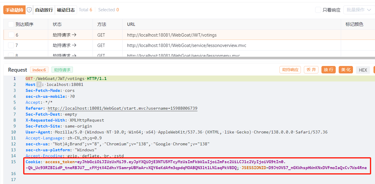 在抓到的包中的cookie参数可以看到JWT token