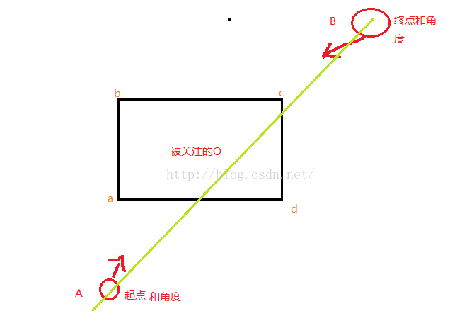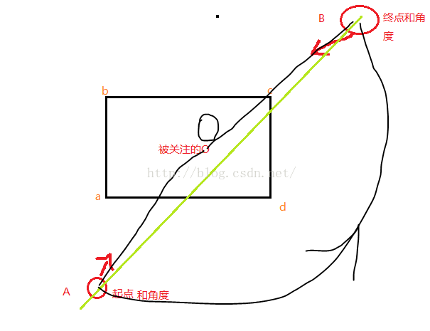 条件:abcd这个矩形盒差不多是物体O的顶视图尺寸,A点箭头是相机所在的起点和角度,B点为目标点需要观察的角度。