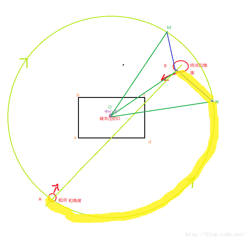 But,实际A到O的具体和B到O的具体相等的情况太特殊了,更多时候,OAB只是一条普通的任意曲线!我甚至查了贝塞尔曲线相关的东西,但是发现起讫点AB虽然确定了,但如何调整这条弧的弧度却成了问题。最终我的处理方案近乎于这样的曲线:(图中荧光黄的部分!)