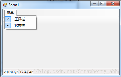 自己写了一个小例子,在menuStrip菜单栏中设置带有复选框的按钮,实现工具栏和状态栏的显示和隐藏。【工具栏和状态栏按钮默认是被选中的,即显示】