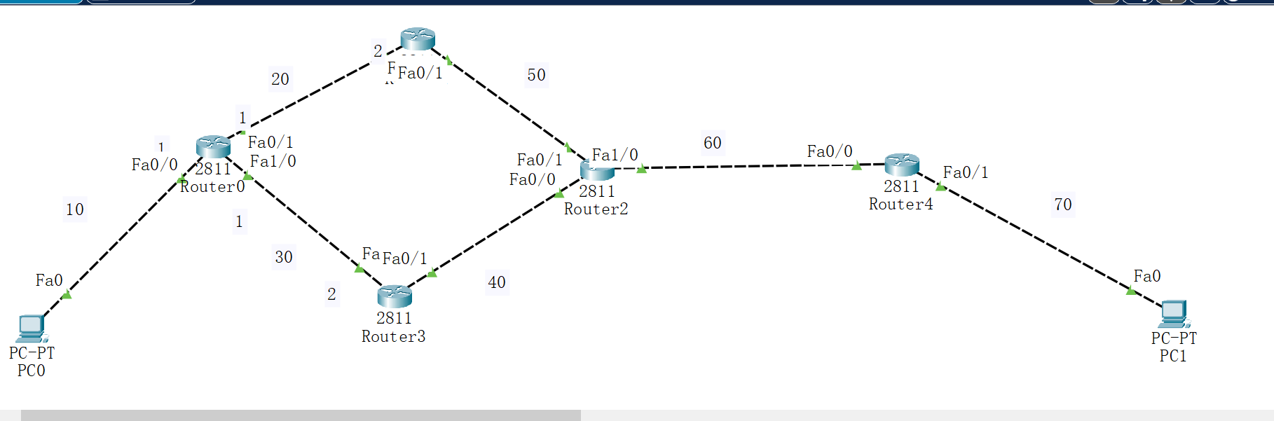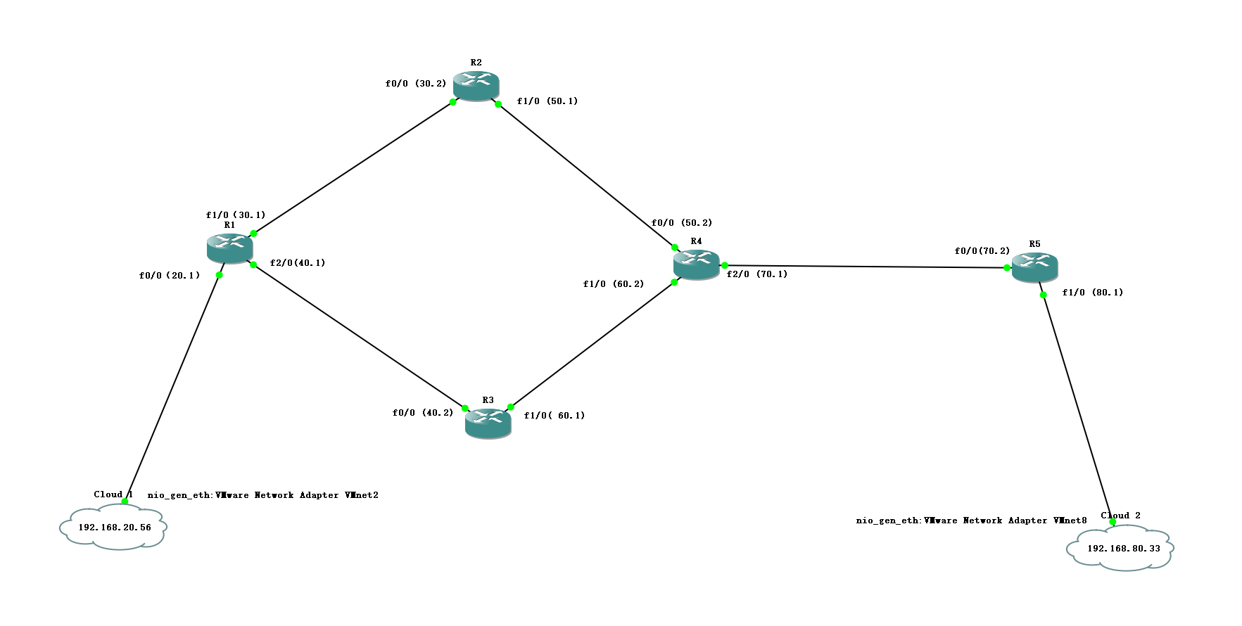依次分享5个路由器的各个网段即可实现两台虚拟机之间的通讯